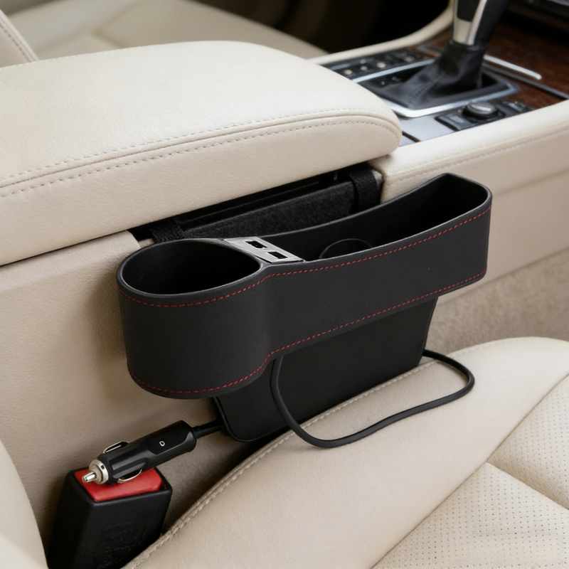 ● Wielofunkcyjny organizer samochodowy z miejscem na napoje, USB i ładowaniem – idealny do przechowywania drobiazgów podczas podróży. ● Wyposażony w porty USB, umożliwia jednoczesne ładowanie kilku urządzeń, zapewniając wygodę i porządek w aucie. ● Solidna konstrukcja i łatwy montaż między siedzeniami, skutecznie wykorzystuje niewykorzystaną przestrzeń i zapobiega wypadaniu przedmiotów. ● Praktyczny uchwyt na kubek pozwala na bezpieczne przechowywanie napojów, minimalizując ryzyko rozlania podczas jazdy. ● Nowoczesny design pasujący do każdego wnętrza samochodu, doskonały prezent dla każdego kierowcy dbającego o porządek.